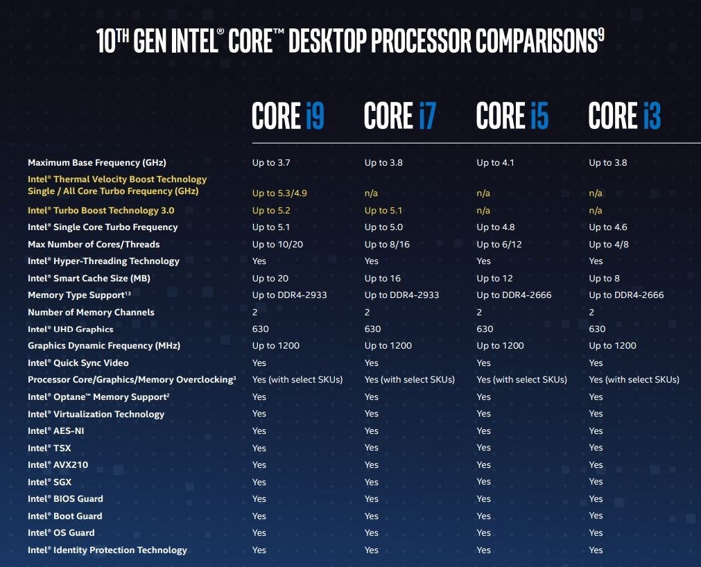 Obecně Intel nabídne i procesory Core 10. generace ve třech variantách – jako odemčené připravené pro přetaktování a mířící mezi nejnáročnější uživatele a herní nadšence. Dále jde o standardní variantu a naposledy o variantu bez integrovaného grafického jádra – tedy např. Core i9-10900KF. Ve výchozí výbavě přitom tento model obsahuje integrovaný grafický čip Intel UHD 630.