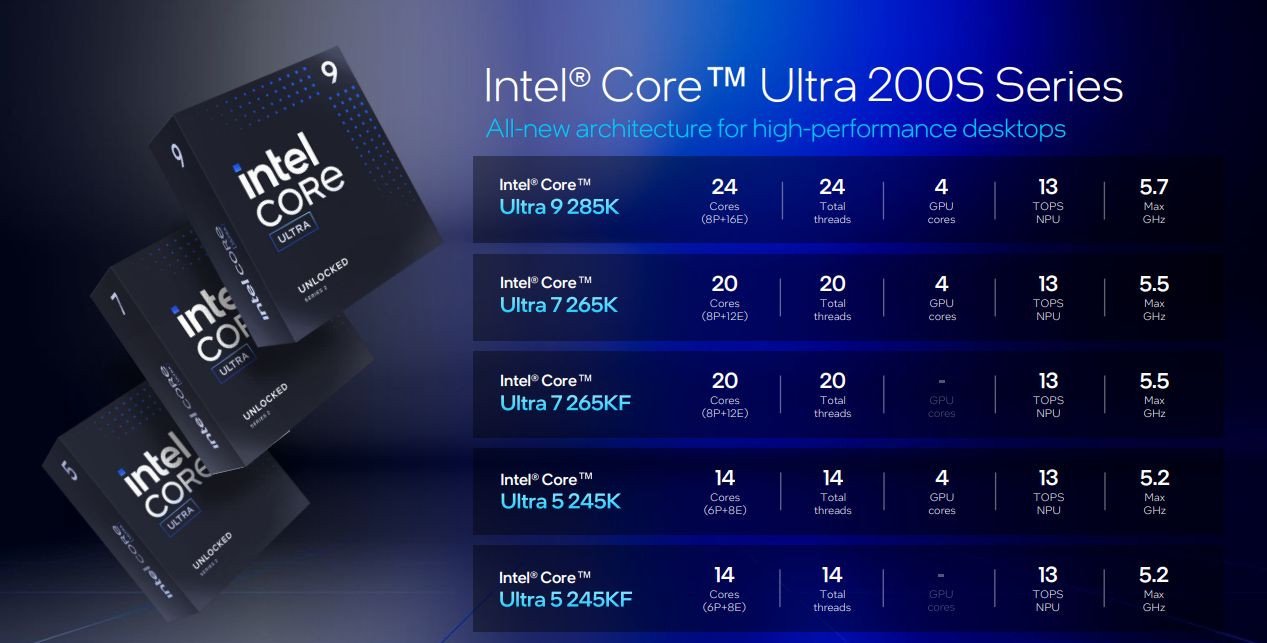 Všechny nové procesory jsou odemčené pro taktování a liší se především taktem a počtem jader. Dostupné budou jak varianty s integrovanou GPU, tak verze bez grafického čipu. NPU (a grafické procesory v případě takto vybavených čipů) jsou u všech modelů totožné.