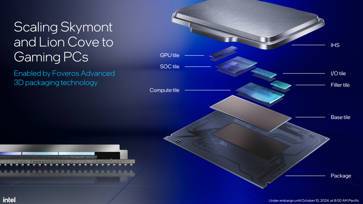 Zásadní změnou je u generace Arrow Lake přechod na čipletovou konstrukci, kdy je několik různých křemíkových částí (čipletů) spojeno dohromady prostřednictvím technologie Intel Foveros. U čipů řady Core Ultra 200S se jako základ používá dlaždice vyrobená společností Intel, která poskytuje prostor a „komunikační podhoubí“ čtyřem dlaždicím vyrobeným u TSMC: výpočetní dlaždicí s jádry CPU, dlaždicí pro grafická jádra; dlaždicí SoC (obsahuje NPU, bloky pro kódování a dekódování videa a obrazové výstupy) a I/O dlaždicí, která se stará hlavně o paměťový řadič DDR5 (nové čipy již po vzoru AMD nepodporují paměti DDR4). Z hlediska operačních pamětí zvládnou procesory celkově adresovat až 192 GB RAM (a až 48GB moduly s maximálním výkonem 6 400 MHz).