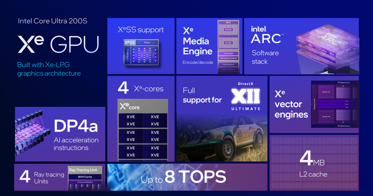 GPU využívá čtyři jádra (Xe) založená starší verzi GPU architektury (Alchemist) z řady A grafických procesorů Intel Arc. I zde je tak podporován hardwarově akcelerovaný ray tracing, kvalitní upscaling (XeSS) a hardwarově akcelerované kódování a dekódování videokodeku AV1.