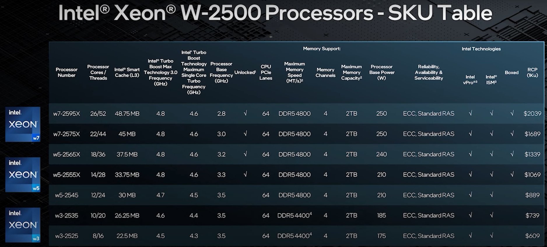 Levnější řada Xeonů W-2500 získala dvě jádra navíc, takže nejvyšší řada Xeon W9-2595X má nyní 26 jader při výkonu 250 W. To je opět o 25 W více ve srovnání se základními parametry modelu Xeon W9-2495X.