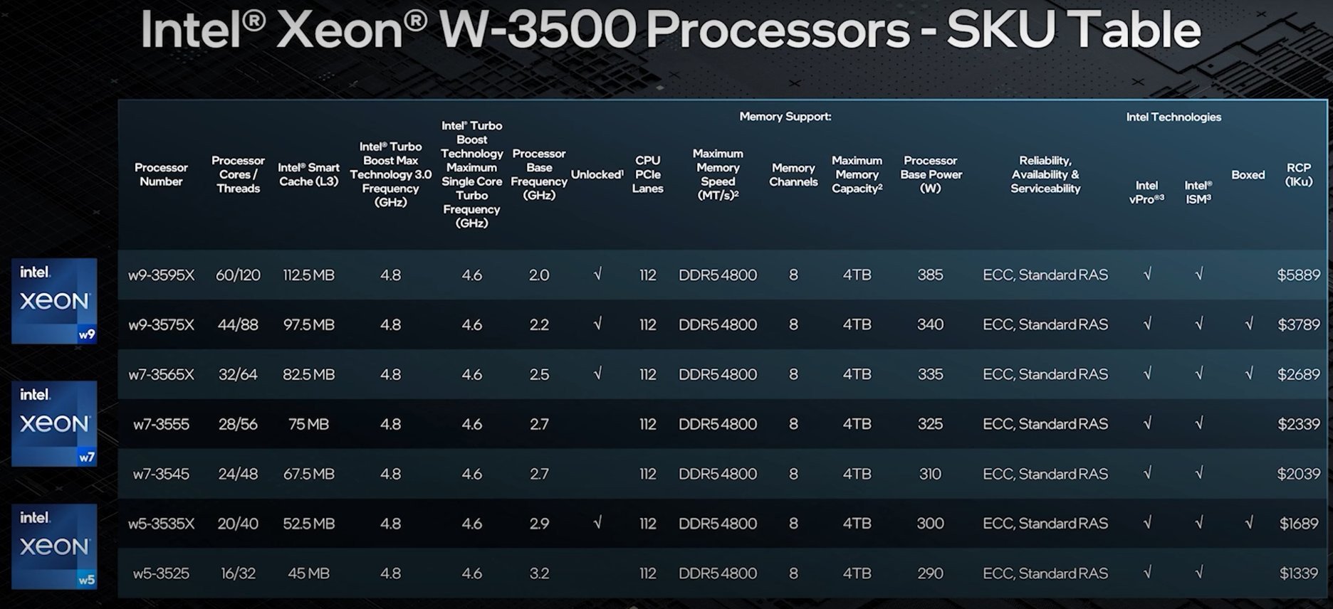 Pokud jde o počet jader, společnost Intel přidala do různých modelů Xeon W-3500 čtyři až osm jader při zachování jejich cenových relací. Nejvyšší model řady Xeon W9-3595X má nyní 60 jader, ale jeho základní příkon je 385 W, což je o 35 W více než u jeho předchůdce Xeon W9-3495X, který měl 56 jader. Obecně může TDP atakovat až 385 W při práci procesoru na základních taktech nebo dokonce až 462 W při aktivním „boostu.“