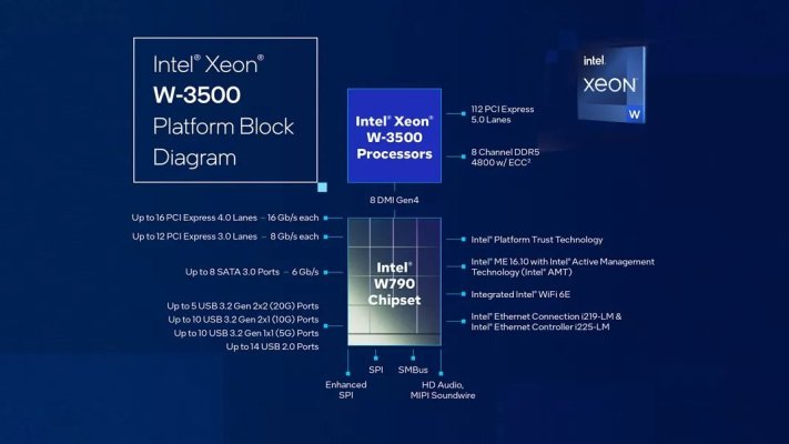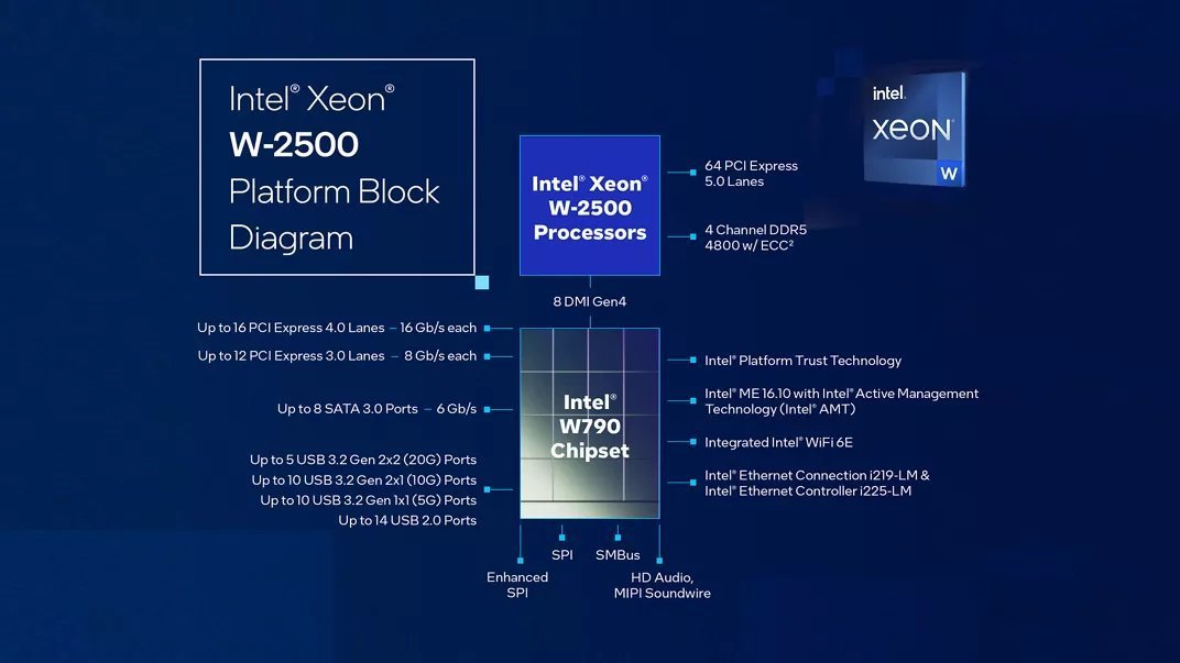 Kódové označení napovídá, že novinky Intel Xeon W-2500 a W-3500 Series využívají architekturu Intel Sapphire Rapids a nabízejí tedy až 60 jader (a 120 výpočetních vláken). Výbava dále čítá čtyři nebo osm paměťových kanálů a podporu až pro 4TB paměti DDR5-4800 v provedení ECC a RAS (s výjimkou několika modelů řady W-2500, které umožňují nasazení modulů DDR5-4400) a také 64 (W-2500), respektive 112 (W-3500) linek PCIe 5.0 pro připojení výkonných periférií. Čipset nabízí také až 16 linek PCIe generace 4.0 a až 12 linek PCIe generace 3.0.