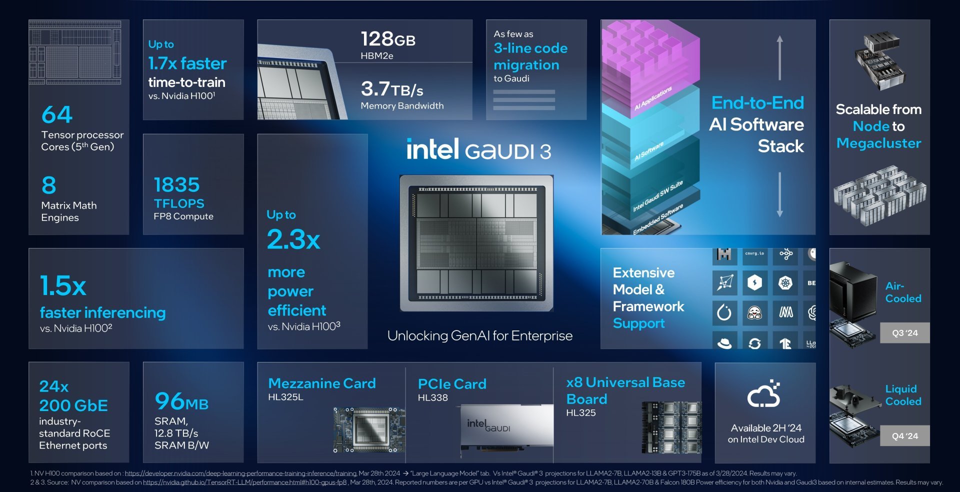 Akcelerátor Intel Gaudi 3 staví na oceňovaných vlastnostech svého předchůdce Gaudi 2, mezi které patří např. výkon a škálovatelnost. Gaudi 3 přináší čtyřnásobné zvýšení výpočetní kapacity pro AI (BF16), 1,5násobné zvýšení šířky paměťového pásma a dvounásobné zvýšení šířky síťového pásma, což představuje významný skok ve výkonu a produktivitě pro trénování a odvozování umělé inteligence na populárních velkých jazykových (LLM) nebo multimodálních modelech.