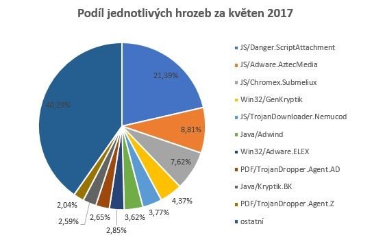 Zavirované přílohy e-mailů, které obsahují škodlivý kód Danger, byly i v květnu nejčastější bezpečnostní hrozbou na českém internetu. Představovaly víc než každou pátou detekci pokusu o průnik do počítačů. Ransomware WannaCry, který byl v uplynulých týdnech v popředí zájmu, se na celkovém počtu hrozeb podílel pouze 0,15 %.