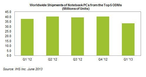 Produkce ODM (Original Design Manufacturer) výrobců činila od ledna do března 33,2 milionu kusů, což je oproti 40,1 milionům kusů 17% pokles oproti stejnému období loňského roku. Ztráta vynikne zejména při pohledu na výsledky z posledního čtvrtletí loňského roku, kdy dodávky notebooků naopak rostly.