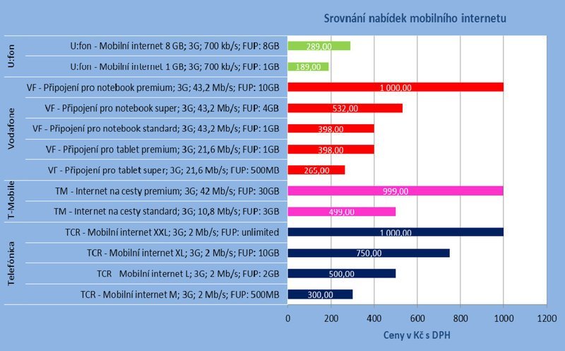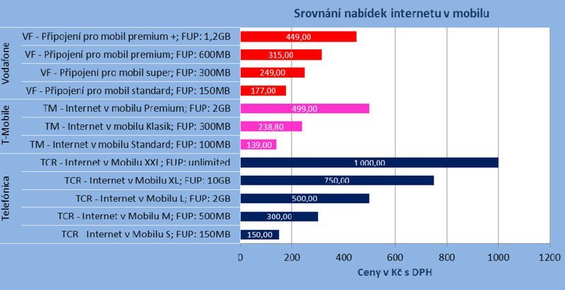 Níže uvedený graf představuje nabídku mobilních operátorů služeb internet v mobilu ke konci roku 2012. Jednotlivé nabídky operátorů jsou porovnány dle tarifů s odlišným datovým limitem (FUP). Oproti předešlému roku rozšířili společnosti Vodafone a Telefónica svoji nabídku o tarify s vyšším datovým limitem. Společnost T-Mobile navýšila datový limit u jednoho ze svých stávajících tarifů.