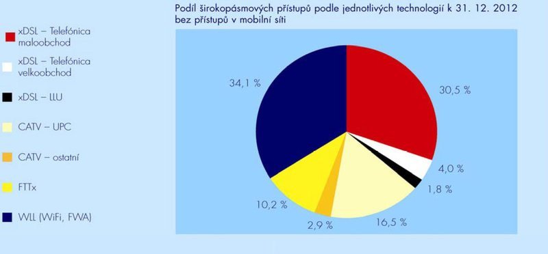 Na konci roku 2012 bylo v ČR aktivních 13,5 milionů SIM karet. Tržní podíl jednotlivých mobilních operátorů je relativně stabilní. Přístup k internetu na maloobchodním trhu je nejčastěji uskutečňován prostřednictvím technologie xDSL. Co dále vyplývá z dat ČTU?
