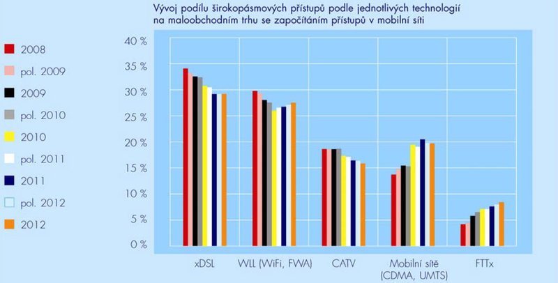 Postupné snižování podílů technologií xDSL a CATV na trhu širokopásmového přístupu k internetu ve prospěch jiných technologií, zejména FTTx a přístupů v mobilních sítích, je v souladu s očekáváním ČTÚ i trendem v jiných zemích Evropské unie, kde také dochází k rozvoji optických sítí a k růstu mobilních přístupů. Trendy vývoje podílu širokopásmových přístupů k internetu podle jednotlivých technologií na maloobchodním trhu mezi roky 2008 až 2012 dokumentuje další graf.