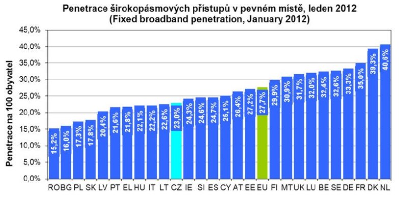 Z hlediska mezinárodního srovnání (viz další graf) je zřejmé, že se penetrace služeb širokopásmového přístupu internetu ČR zvyšuje (ze 14,7 % ze závěru roku 2007 až na 23 % k lednu roku 2012). Ve srovnání s dalšími zeměmi Evropské unie jsou však dosažené hodnoty penetrace v České republice stále pod průměrem (průměr Evropské unie 27,7 %).