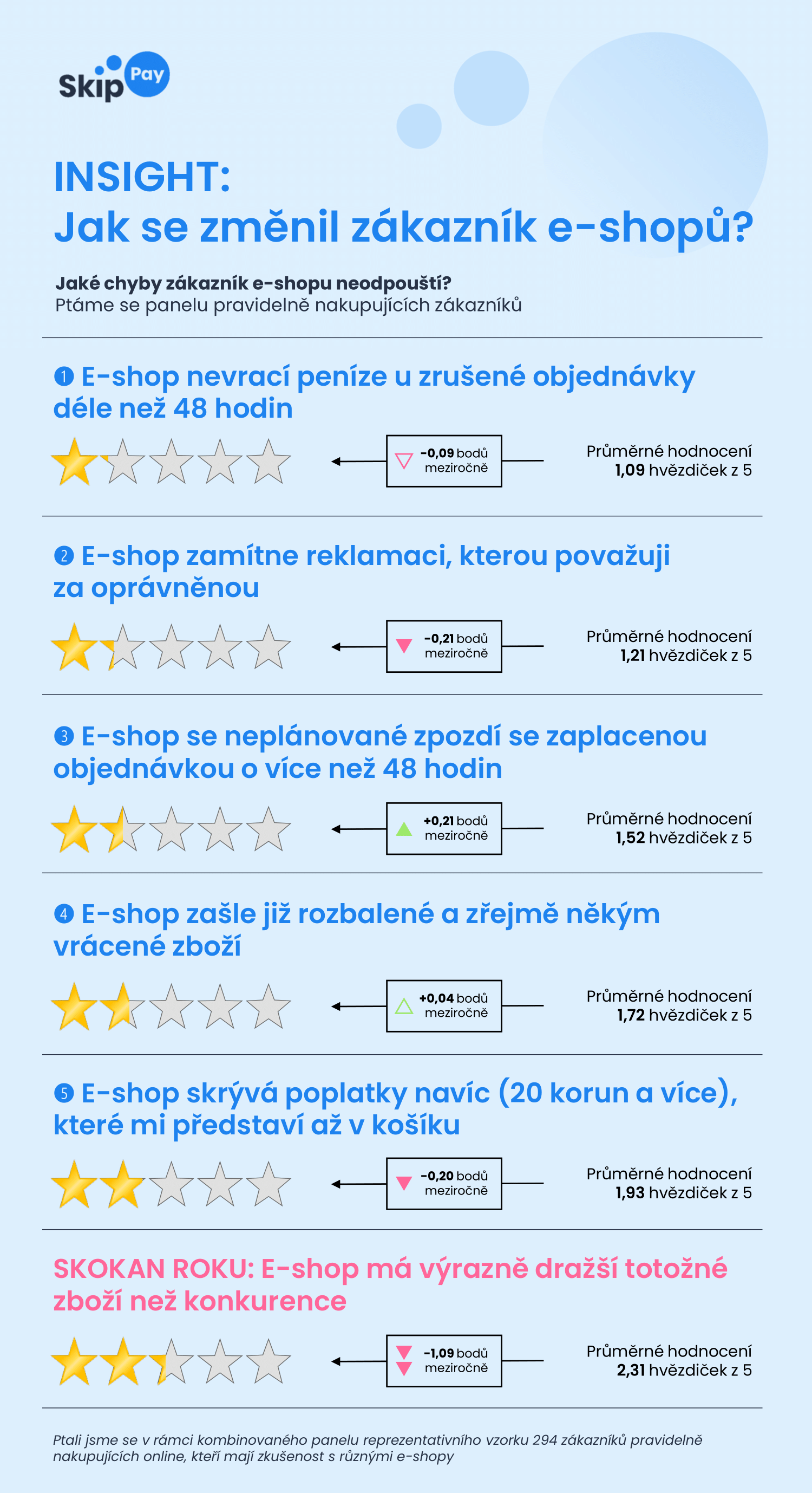 Na prvním místě se stejně jako loni s 1,09 hvězdičkami z 5 objevily e-shopy, které nejsou schopny déle než 48 hodin vrátit peníze při platbě předem, pokud není zboží nakonec převzaté. Na druhém místě se s 1,21 hvězdičkami objevuje zamítnutá reklamace, o jejíž oprávněnosti je zákazník skálopevně přesvědčen. Na třetím místě je výrazné zpoždění (více než 48 hodin) v dodání již zaplacené objednávky (1,52 hvězdičky).