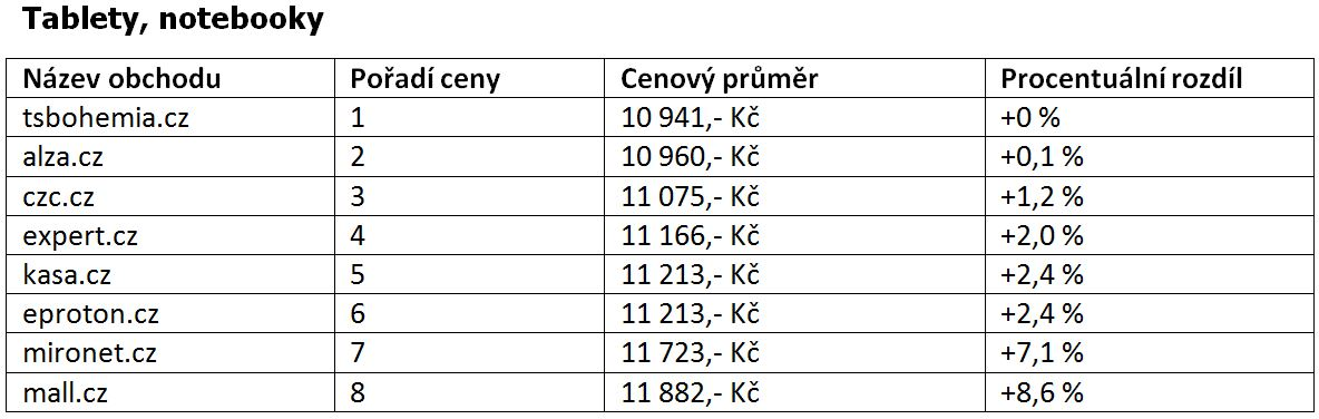 Průzkum společnosti Karsa Technologies dále ukázal na výrazné rozdíly v cenách u konkrétních kategorií produktů. Právě u nich se totiž projevuje rozdílná cenová strategie jednotlivých e-shopů. „Pokud se zaměříme na srovnání cen u konkrétních kategorií výrobků v obchodech, je dobře patrné, že každý e-shop je silný u jiných typů produktů. Například při koupi tabletu či notebooku si silnou pozici na trhu udržuje T.S.Bohemia a Alza.cz, kteří nabízejí toto zboží v průměru za 10 941 Kč, respektive 10 960 Kč. Naopak průměrná cena u obchodního domu Mall.cz činí v této kategorii 11 882 Kč, což představuje rozdíl 8,6 %,“ upozornil Michal Ježek ze společnosti Karsa Technologies, která nabízí provozovatelům internetových obchodů nástroj pro analýzu cen produktů v reálném čase i denní reporting konkurence.