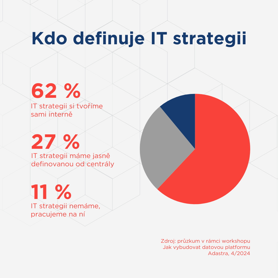 „Velmi pozitivně vnímáme fakt, že 62 % velkých společností si samo vytváří IT strategii,“ poznamenal David Kaláb, viceprezident pro oblast data managementu ve společnosti Adastra. Pouze deset procent oslovených společností žádnou IT strategii nemá nebo na ní právě pracuje. Zajímavý je i fakt, že centrála/mateřská společnost definuje IT strategii pouze u necelých 30 % firem.