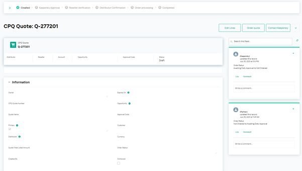 Aktualizované rozhraní LMP také zjednodušuje práci distributorů. Jejich úloha sice zůstává stejná – pomáhat partnerům svými odbornými znalostmi v oblasti prodeje, vývoje a finančních programů – mohou však ušetřit čas strávený rutinním schvalováním a soustředit se na rozvoj svého podnikání. Místo vytváření a potvrzování objednávek v nástroji pro správu objednávek dodavatele stačí distributorům jediné kliknutí, aby po kontrole finančních podmínek partnera potvrdili zadání objednávky prostřednictvím LMP. Ovládací panel poskytuje všechny potřebné informace o objednávkách od konkrétního partnera a také možnost v případě potřeby kontaktovat společnost Kaspersky nebo partnera.