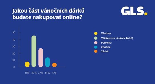 Online nákupy se těší stále větší oblibě. To platí i v předvánočním období, kdy nákup v e-shopu umožňuje vyhnout se davům v obchodech a ušetřit čas. Pro 53 % Čechů je proto nákup všech či valné většiny dárků přes internet jasnou volbou. Třetina lidí pak nakoupí online polovinu dárků a 14 % respondentů pořídí online jen čtvrtinu dárků. Online nákupů využijí mladší lidé více než starší generace. „Nákupy na internetu byly vždy doménou především mladší generace, což potvrzuje i náš průzkum. Všechny nebo většinu dárků nakoupí online především lidé ve věku 18 až 44 let (61 %). Naopak u lidí ve věku 54-65 let je to jen 35 %,“ uvedl Pavel Včela, ředitel GLS Česká republika.