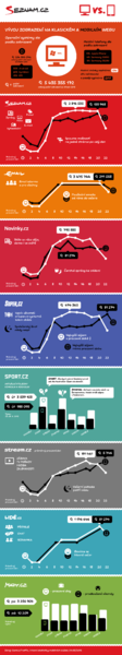 Zpravodajství (Novinky.cz) Češi na mobilu i počítači zapínají během celého dne, největší růst je ráno – jsme zvyklí si před prací zjistit, co se děje, a po obědě se ujistit, že jsme za dopoledne o nic zajímavého nepřišli. Lifestylové zpravodajství vyhledáváme, pravděpodobně jako oddech, v práci – jak jinak si vysvětlit ten velký rozdíl mezi mobilními a klasickými zobrazeními v pracovní době? A sportovní zpravodajství je a vždy bude specifické. Využívání služby Sport.cz velice úzce závisí na konání sportovních událostí, což je vidět i na grafu.