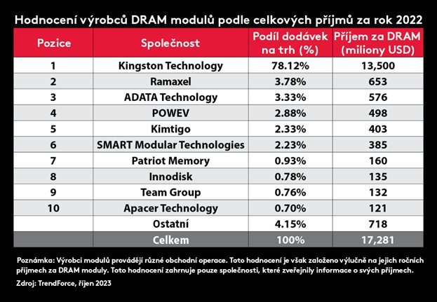 TrendForce uvádí, že společnost Kingston zvýšila své příjmy meziročně o 4,6 % na 13,5 miliard USD, a tím si udržela pozici globálního lídra již 20. rok po sobě.