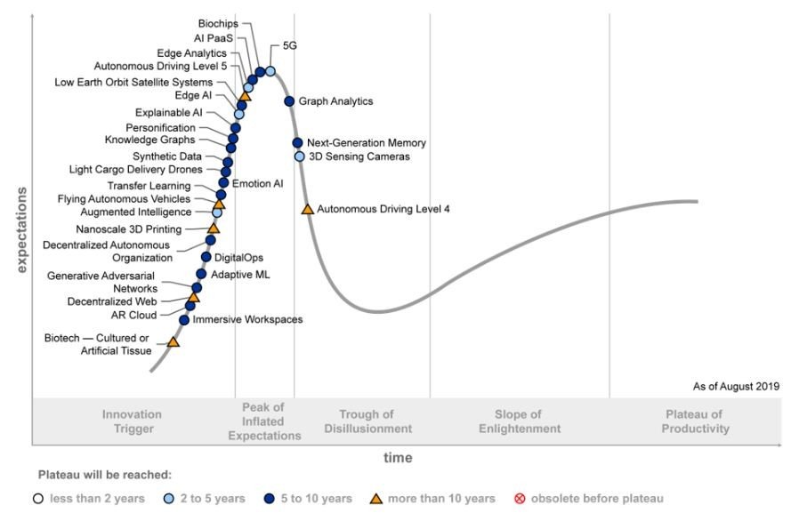 Hype křivka rodících se technologií pro rok 2019 obsahuje 29 technologií a technologických oblastí, které by podniky měly pozorně sledovat – jejich průsečíkem je pět technologických trendů, jež umožňují utvářet nové typy zážitků pomocí AI a dalších fenoménů z digitální oblasti.