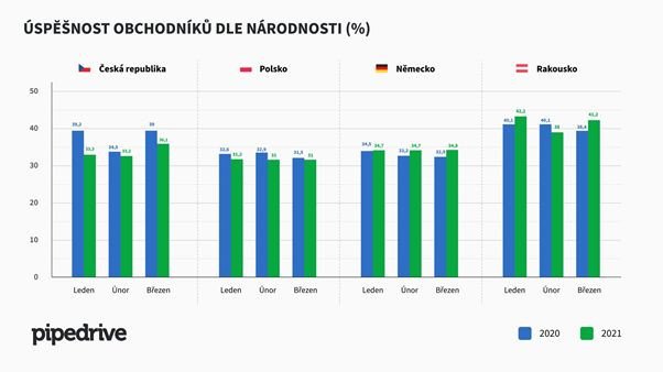 ymění, tím je šance na jejich zdárné uzavření nižší. Češi dosahovali v prvním kvartálu 2021 průměrné úspěšnosti kolem 34 %, Poláci 31 %, Němci 35 % a Rakušané 40 %. To je o něco méně oproti stejnému období loňského roku, pro srovnání se českým obchodníkům dařilo až v 40 % případů. Jejich úspěšnost se tedy ještě nevrátila na předcovidovou úroveň.