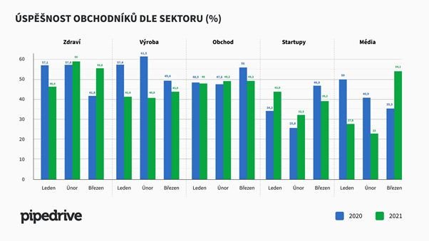 Nejlepších výsledků v prvním kvartálu 2021 dosahovali čeští obchodníci v oblastech zdravotnictví (53 %), výroby (42 %) a obchodu (49 %). Dobře si vedly rovněž technologické startupy (38 %) a média (35 %). Ve stejném období loňského roku byla úspěšnost v sektoru zdravotnictví průměrně 52 %, ve výrobě 56 % a v oblasti obchodu 51 %. Právě segment výroby byl totiž pandemií nejvíce zasažen. Obchodníci v oblasti technologických startupů pak dosahovali úspěšnosti 36 % a v médiích dokonce 42 %.