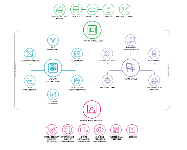 Workplace Hub funguje jako centrum, zjednodušující a zefektivňující IT organizace při snížení celkových nákladů na správu IT. Zároveň dokáže poskytovat v reálném čase datové analýzy, které pomohou ke zlepšení firemních procesů. Nový ekosystém Workplace Hub, řídící a koordinující celou IT infrastrukturu a služby napříč stávajícími i budoucími IT systémy, poskytuje uživatelům centrální přehledový panel, který nabízí obsáhlý náhled na využívání IT v podniku, což umožňuje správu a optimalizaci systémů.