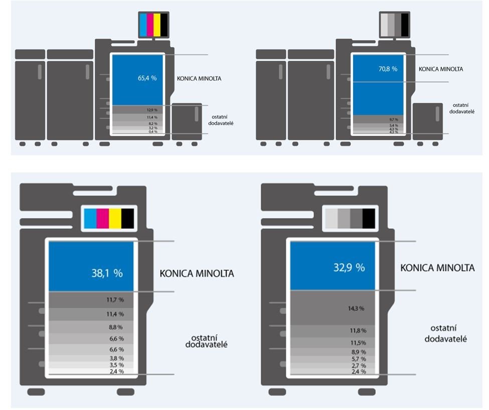 Tržní podíly Konica Minolta v ČR dosáhly v případě černobílých produkčních strojů 70,8 % a v segmentu barevných digitálních produkčních strojů pak vzrostly na 65,4 %. Na výrazně rostoucím trhu barevných kancelářských multifunkčních tiskáren formátu A3 činil podíl společnosti 38,1 %. U černobílých multifunkčních tiskáren formátu A3 pak dosáhla Konica Minolta tržního podílu 32,9 %. V segmentech kancelářských multifunkčních tiskáren formátu A4 drží Konica Minolta podíly 18,1 % u barevného a 16,8 % u černobílého tisku.