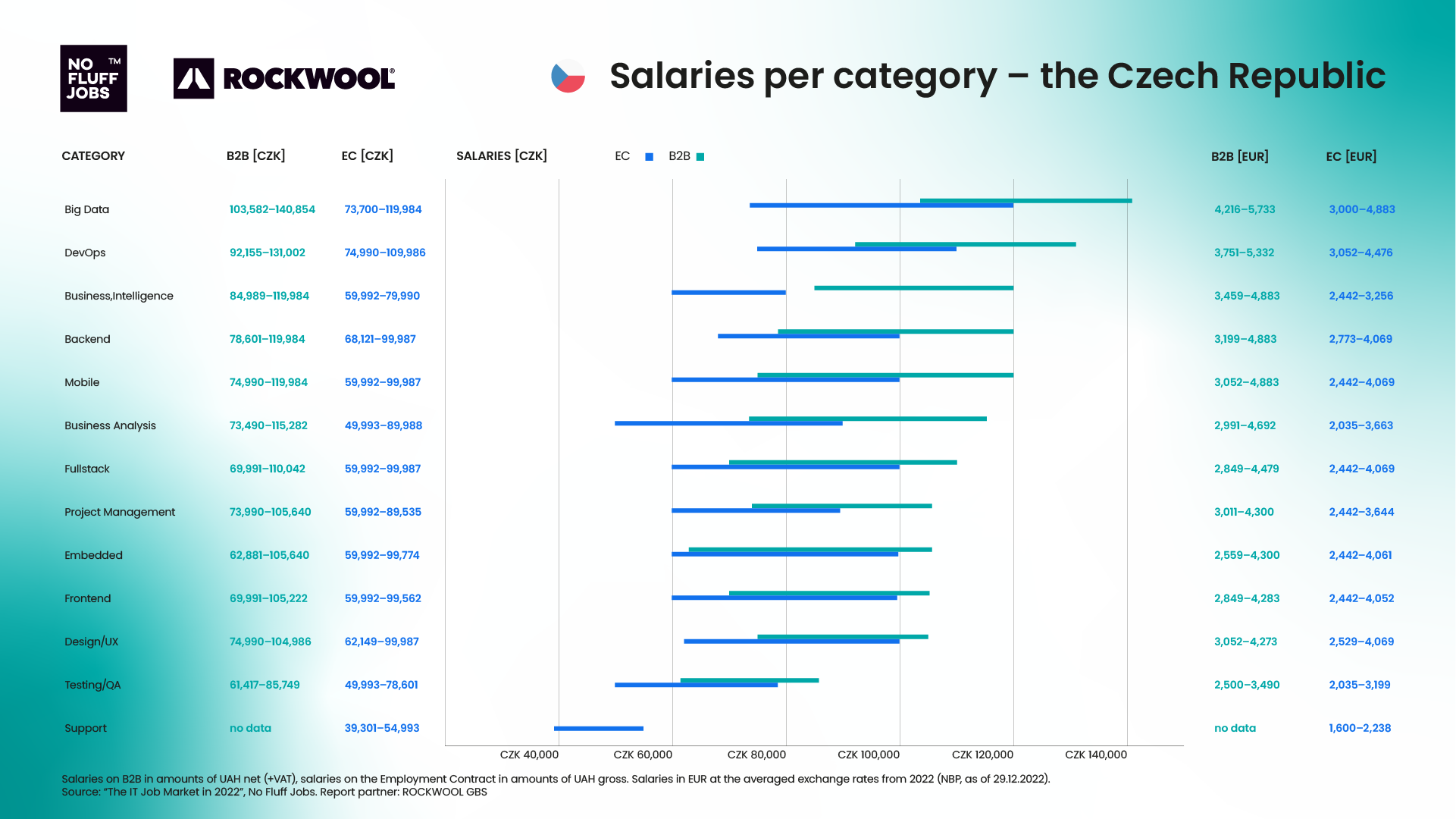 Druhé nejvyšší ohodnocení zaměstnavatelé nabízejí odborníkům v DevOps. Inzeráty tohoto zaměření proklamují mzdu pro zaměstnance 92 155 – 131 002 Kč (popřípadě 74 990 – 109 986 Kč pro freelancery). Na třetím místě se umisťují inzeráty Business Intelligence (BI) nabízející 84 989 – 119 988 Kč (59 992 – 79 990 Kč).