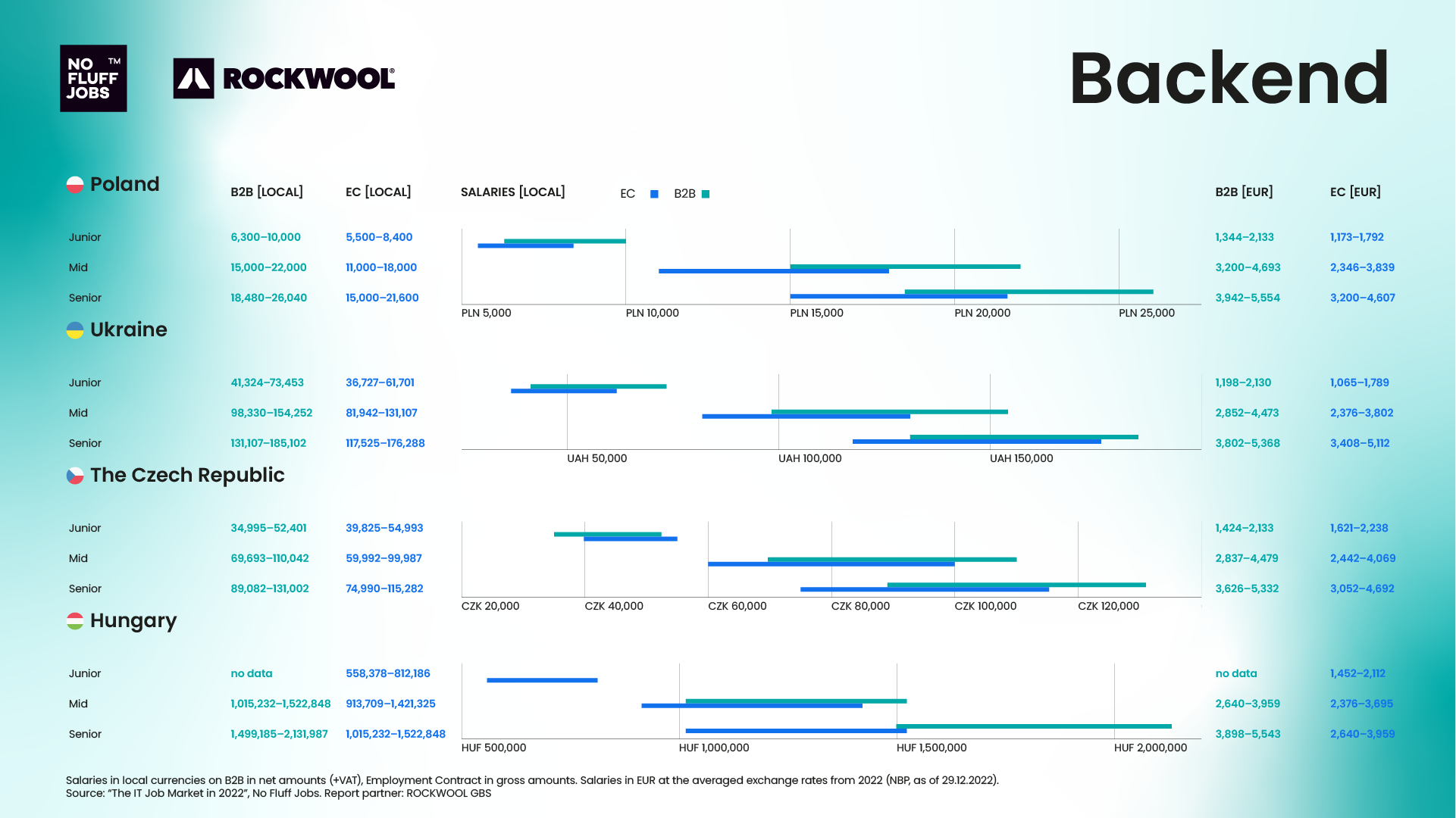 V loňském roce pokračoval v regionu střední a východní Evropy trend v práci na dálku. Na 62 % inzerátů nabízelo možnost pracovat na dálku (53 % v r. 2021), 10 % umožňovalo pracovat hybridně (8 % v 2021) a 28 % případů požadovalo práci v kanceláři (39 % v 2021). Za změnou stojí zejména dva důvody – firemní škrty v rozpočtech a nutnost přizpůsobit se trhu a požadavkům kvalitních kandidátů, kterých je nedostatek. Tento fakt hraje kandidátům do karet, i pokud jde o finanční ohodnocení, hlavně u mid a seniorních odborníků. Z dat No Fluff Jobs je zřejmé, že ohodnocení v inzerátech s full-time nabídkou práce zcela na dálku, je o 20-25 % vyšší, než u inzerátů vyžadujících práci hybridně či v kanceláři.