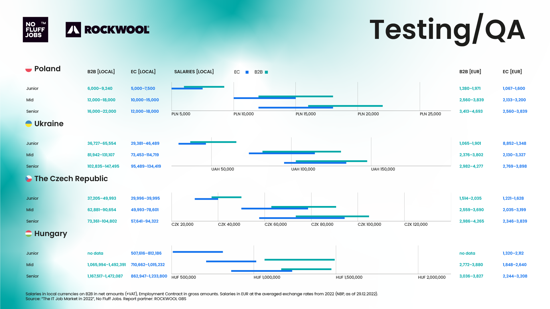 Pokud jde o nejpopulárnější kategorie, často nejsou těmi nejlépe ohodnocenými. Specialisté úrovně mid na Backend můžou dosáhnout na 59 992 – 99 987 Kč hrubého v zaměstnaneckém poměru. Odborníci na Frontend můžou mít 52 401 – 89 988 Kč, Fullstack 59 992 – 99 987 Kč a v Testingu/QA pak 49 993 – 78 601 korun.