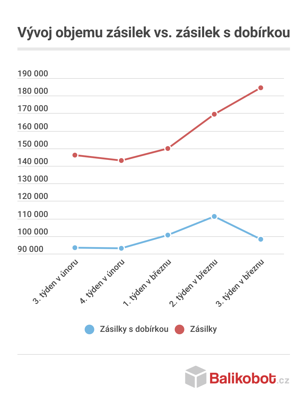 V průběhu března klesl v ČR objem odeslaných B2B zásilek zhruba o šestinu a o 14 % se snížil také podíl nákupů na dobírku. Vyplývá to z údajů služby Balikobot.cz, která pomáhá firmám agregovat přepravní služby a zefektivnit systém expedice a sledování zásilek.