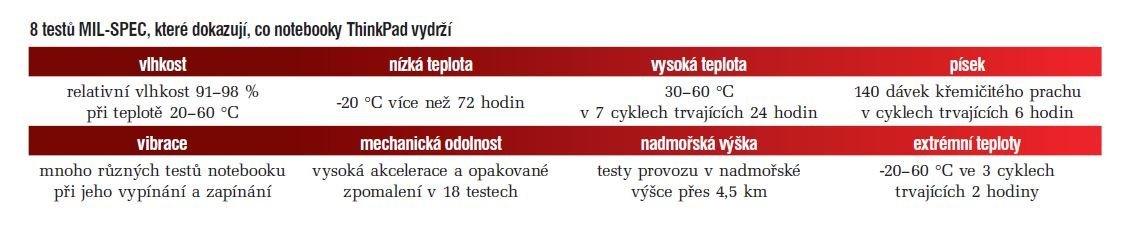 Notebooky ThinkPad absolvovaly celkem osm testů MIL-SPEC dle standardu MIL-STD-810 zahrnujících skladování, přepravu a provoz v náročných podmínkách, nehostinném prostředí, a samozřejmě také nárazy a vibrace. Zkouškami tyto legendární stroje prošly bez vady. O jaké testy se jednalo?