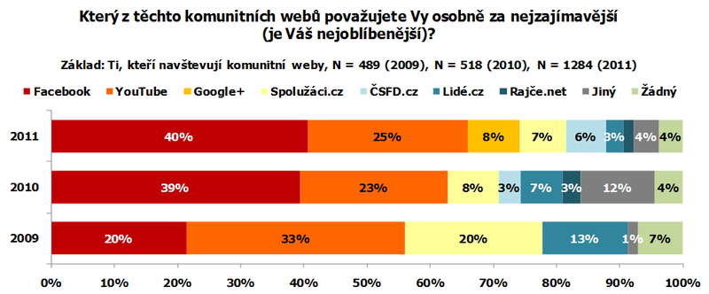 „Zatímco v roce 2010 se české sociální sítě ještě poměrně držely, v 2011 je už pokles návštěvnosti výrazný a týká se i typických představitelů českých komunitních webů, jako jsou Spolužáci.cz a Lidé.cz,“ komentovala výsledky výzkumu Alena Ivánková, Research Project Manager výzkumu. Na první pohled je podle ní patrné, kam tito lidé odcházejí. Facebook a YouTube upoutaly za tři poslední sledované roky většinu internetové populace. Alespoň jednou týdně zláká YouTube a Facebook dva ze tří internetových uživatelů.