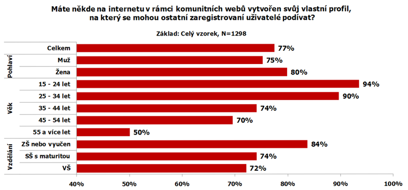 Internetový profil s osobními údaji, který si mohou ostatní zaregistrovaní uživatelé prohlédnout, mají tři čtvrtiny respondentů. Nejmladší generace má takový profil téměř univerzálně (94 procent), podobně i generace 25-34 let (90 procent). Podíl lidí, kteří jsou někde zaháčkovaní, znatelně narostl mezi roky 2009 a 2010, od roku 2010 je však stejný, a to i v různých sociodemografických skupinách.