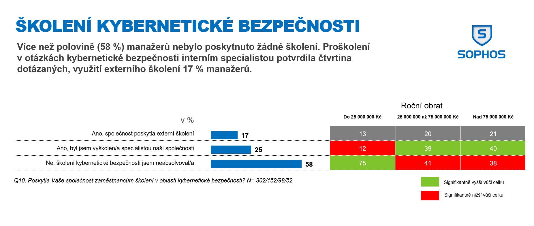 Školení kybernetické bezpečnosti neabsolvovala více než polovina (58 %) českých manažerů. Podíváme-li se na poměr neproškolených manažerů podle velikosti jejich organizací, tak studie odhaluje, že u malých podniků nebyly proškoleny celé tři čtvrtiny (75 %) manažerů, zatímco u středních podniků 41 % a u velkých podniků 38 % manažerů.
