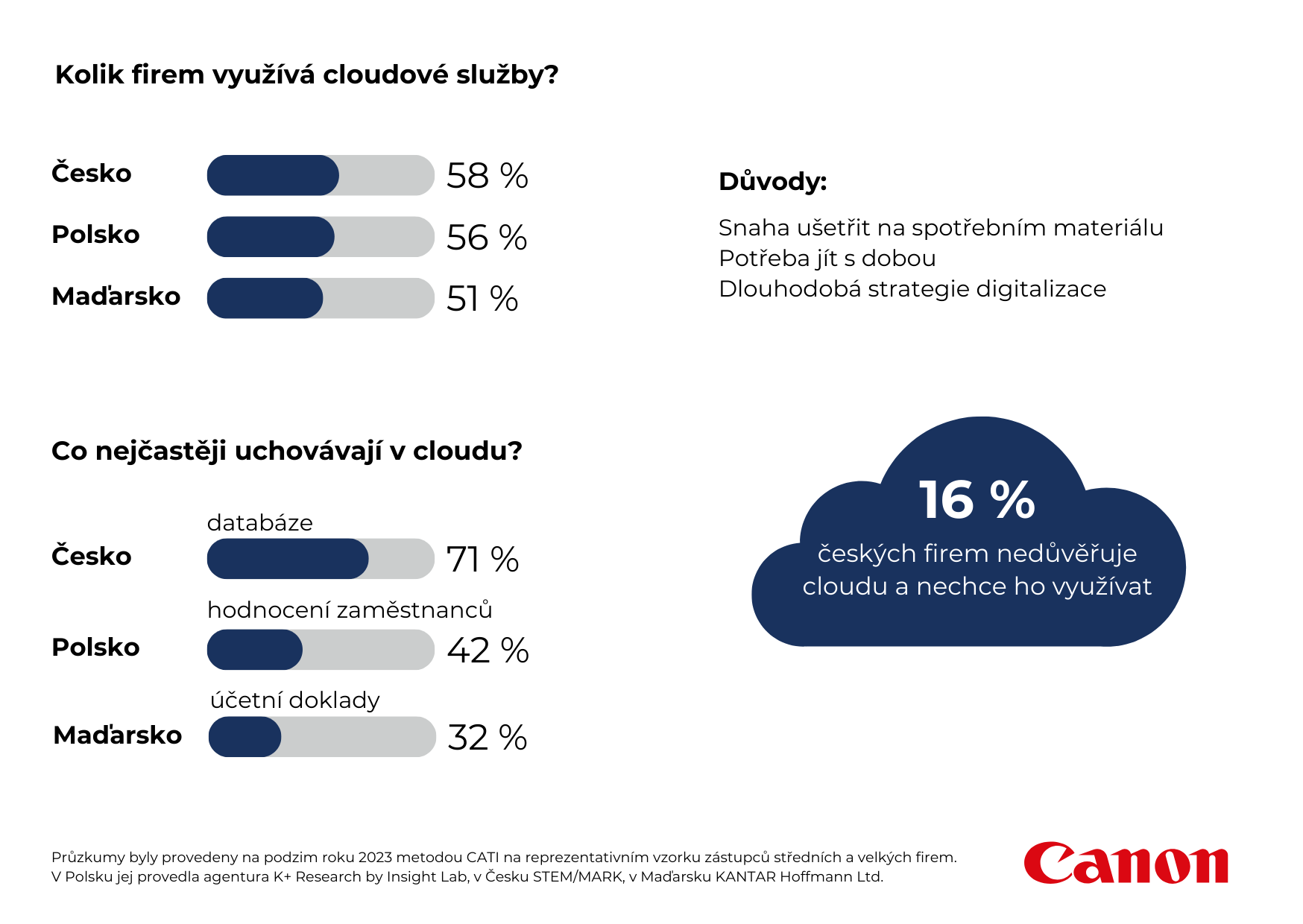 Většina oslovených polských podniků využívá cloud již delší dobu. Častěji to deklarují zástupci velkých firem (56 % oproti 40 % středních firem). Z českých podniků, které začaly zavádět procesy digitalizace, využívá cloudové služby 58 %, z toho 40 % delší dobu. Celých 16 % oslovených v Česku tomuto klíčovému nástroji digitalizace nedůvěřuje a nechce jej využívat. „Číslo je překvapivě vysoké a značí, že je před námi stále dost práce v přesvědčování podnikatelů, že cloudová řešení, třeba uniFLOW Online pro správu firemního tisku a skenování, umožňují větší efektivitu práce a bezpečnost uložených dokumentů,“ dodala Kučmášová.