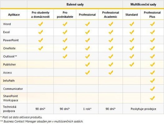 Sada Microsoft Office 2010 nazvaná Pro studenty a domácnosti zahrnuje čtyři základní aplikace: Word, Excel, PowerPoint a OneNote. Její doporučená maloobchodní cena ve formě karty s instalačním kódem činí 2 490 Kč. Sada Pro podnikatele, která je určená menším firmám, obsahuje navíc program Outlook a její doporučená maloobchodní cena v případě karty s kódem činí 5 990 Kč. Sada Professional navíc obsahuje ještě programy Publisher a Access.