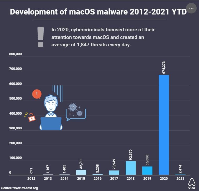Množství zachyceného malwaru pro platformu macOS podle šetření společností Atlas VPN a AV-Test vloni meziročně stouplo o více než tisíc procent. Jiným slovy – zatímco v roce 2019 bylo zaznamenáno 56 556 nových vzorků malwaru, vloni to již bylo 674 273.