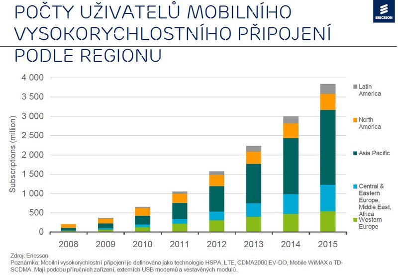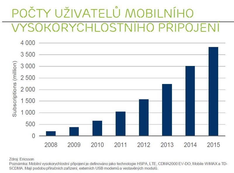 Společnost Ericsson je přesvědčena, že do roku 2015 dosáhne počet mobilních vysokorychlostních připojení počtu 3,8 miliardy - v 95 procentech případů se bude jednat o sítě využívající technologie HSPA, CDMA a LTE.