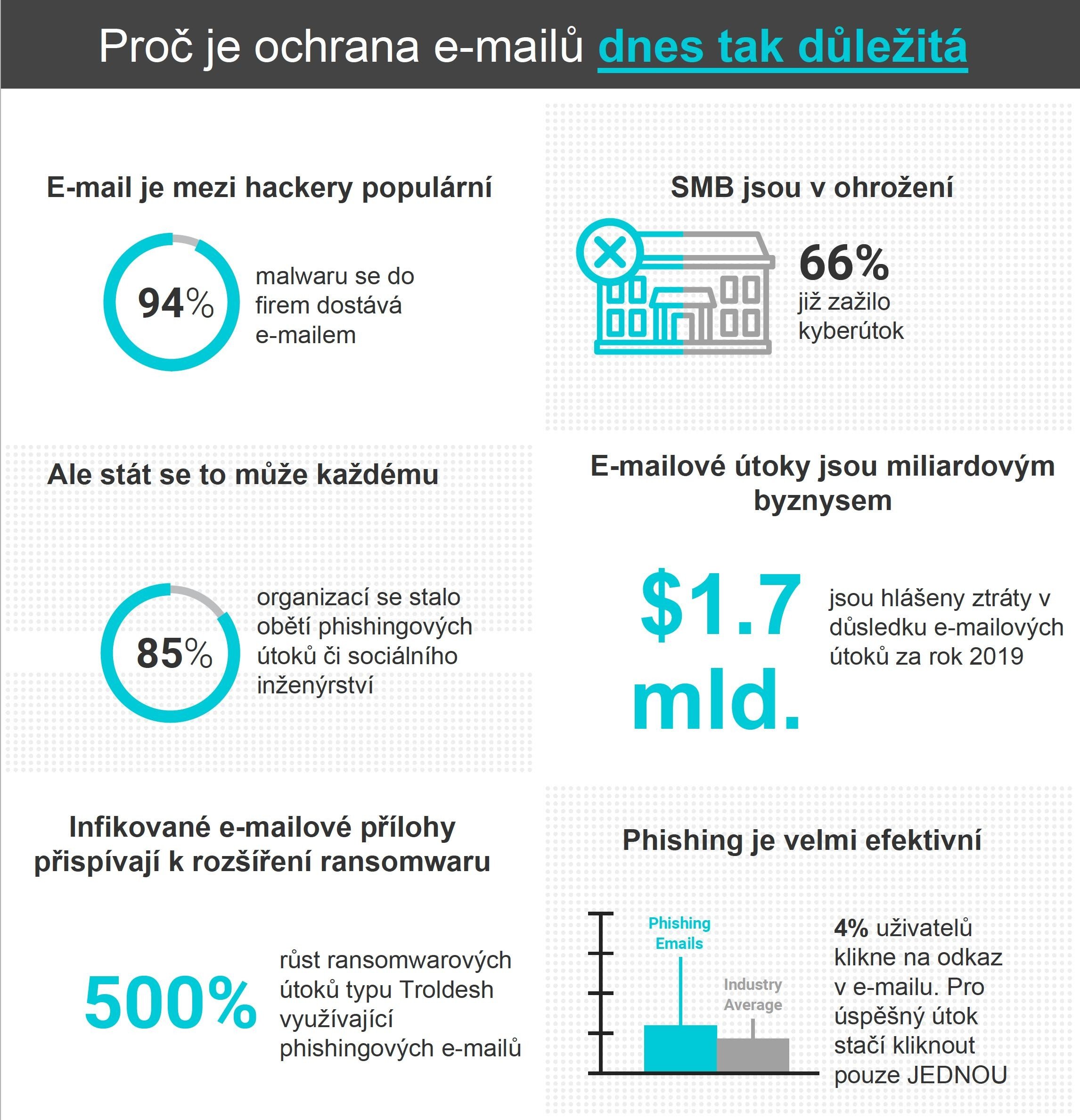K významnému nárůstu phishingových aktivit došlo právě v období koronavirové krize, kdy hackeři zaměřili phishingové kampaně na informace týkajcí se choroby COVID-19 případně jejího léčení. Odhaduje se, že již 85 % organizací zažilo útoky postavené na phishingu nebo sociálním inženýrství. Kybernetické útoky míří také na malé a střední společnosti (SMB) – zkušenost s nimi má 66 % SMB firem – které jsou navíc ohroženější v důsledku omezených rozpočtů na IT. V roce 2019 zapříčinily e-mailové útoky ztrátu 1,7 miliardy dolarů mezi organizacemi po celém světě.