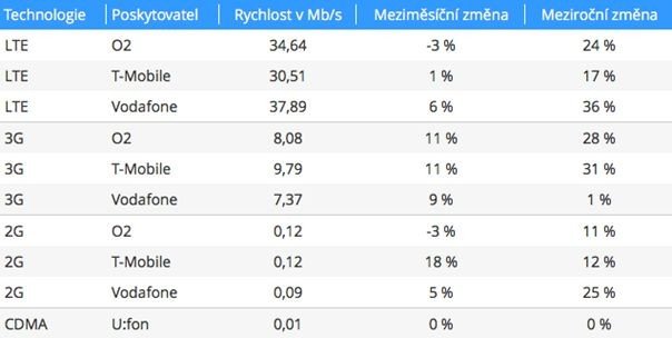 Nejrychlejší LTE internet měl v březnu 2017 operátor Vodafone, naměřena byla průměrná rychlost 37,9 Mb/s, což je o 6 % více než v únoru 2017. „Na druhém místě bylo v březnu O2, u kterého však rychlost meziměsíčně poklesla o 3 % na 34,6 Mb/s,“ uvedla mluvčí serveru DSL.cz Jitka Ernestová. Poslední je s rychlostí stále T-Mobile, naměřili jsme 30,5 Mb/s, což je pouze o 1 % více než v únoru.