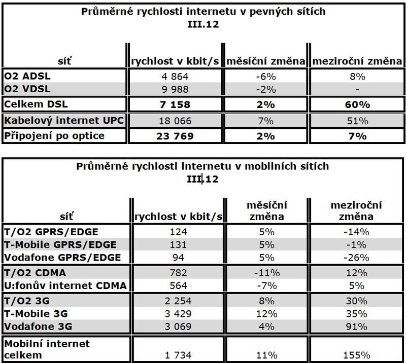 V březnu průměrná rychlost internetu v pevných sítích založených na technologii DSL vzrostla na 7,1 Mbit/s a v meziročním srovnání je o 60 procent vyšší. Průměrná rychlost u společnosti UPC činila 18 Mbit/s a oproti roku 2011 tak narostla o 51 procent.