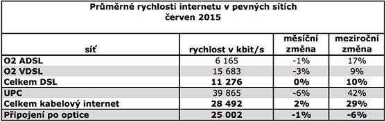 Průměrná rychlost DSL připojení činila 11 276 kbit/s, což je stejné, jako v minulém měsíci, a o deset procent lepší, než ve stejném období loňského roku. Průměrná rychlost kabelového připojení pak činila 28 492 kbis/s a v případě optiky šlo o 25 002 kbit/s.
