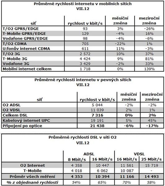 Průměrná rychlost mobilního připojení (všichni čtyři mobilní operátoři) v červenci byla 1,7 Mbit/s, což je téměř stejně jako v červnu. Meziročně se rychlost zvýšila o 139 procent. Nejrychleji data „sviští“ u T-Mobile a to konkrétně 4,4 Mbit/s.