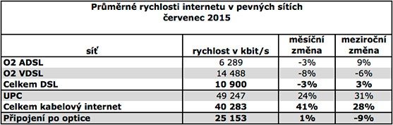 Průměrná rychlost DSL připojení činila 10 900 kbit/s, což je o tři procenta horší než v minulém měsíci, a o tři procenta lepší, než ve stejném období loňského roku. Průměrná rychlost kabelového připojení pak činila 40 283 kbis/s a v případě optiky šlo o 25 153 kbit/s.