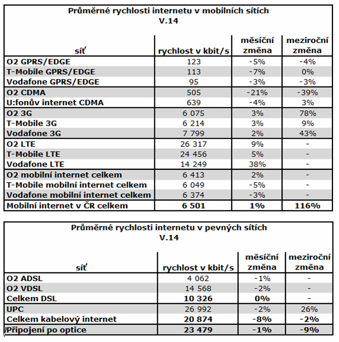 Průměrná rychlost internetu v pevných sítích činila v květnu 23,5 Mbit/s, což je o 1 % nižší rychlost, než jaká byla v dubnu. Meziročně se rychlost snížila o 9 %. Průměrná rychlost kabelového internetu činila 20,8 Mbit/s a oproti minulému měsíci klesla o 8 %, a v meziročním srovnání klesla o 2 %. V sítích UPC potom data sviští rychlostí 27 Mbit/s.
