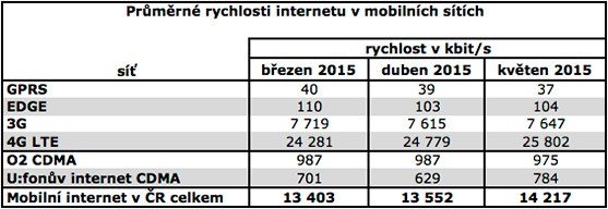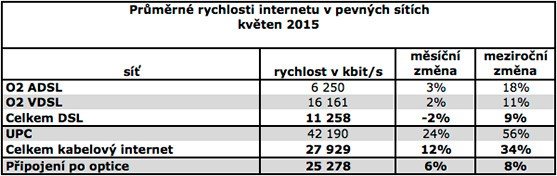 Průměrná rychlost připojení v pevných sítích činila v květnu 2015 25 278 kbit/s, což je o šest procent víc, než v předchozím měsíci, a o osm procent víc, než ve stejném období loňského roku.