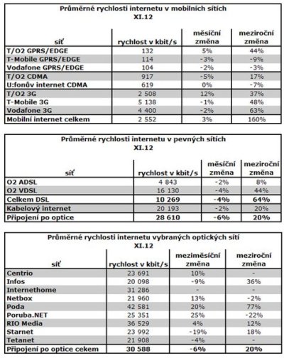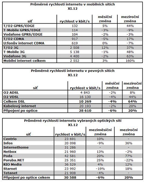 Průměrná rychlost mobilního připojení (všichni čtyři mobilní operátoři) v listopadu činila 2,6 Mbit/s, což je o 3 % vyšší rychlost, než jaká byla v říjnu. Meziročně se rychlost zvýšila o 160 %. Nejrychleji data „sviští“ u T-Mobile a to konkrétně 5,1 Mbit/s.