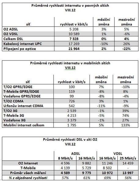 Průměrná rychlost mobilního připojení (všichni čtyři mobilní operátoři) v srpnu byla 1,8 Mbit/s, což je téměř stejně jako v červenci. Meziročně se rychlost zvýšila o 133 procent. Nejrychleji data „sviští“ u T-Mobile a to konkrétně 4,2 Mbit/s.