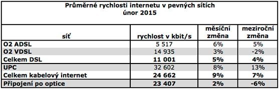 V případě pevných sítí činila průměrná přenosová rychlost 24 662 kbit/s u kabelového internetu a 23 407 kbit/s u optického připojení.