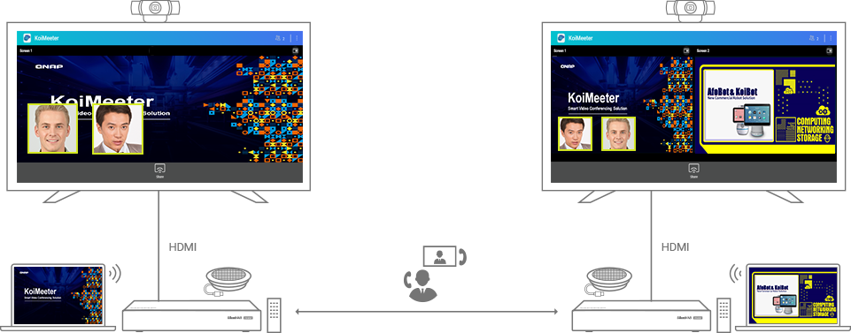 Nejnovější aplikace KoiMeeter usnadňuje vytváření videokonferenčního systému. Uživatelé jednoduše nainstalují KoiMeeter do zařízení QNAP NAS a připojí NAS k televizoru přes port HDMI. Poté se připojí kompatibilní kamery a mikrofony k portu USB zařízení NAS a chytrý videokonferenční systém je hotový.